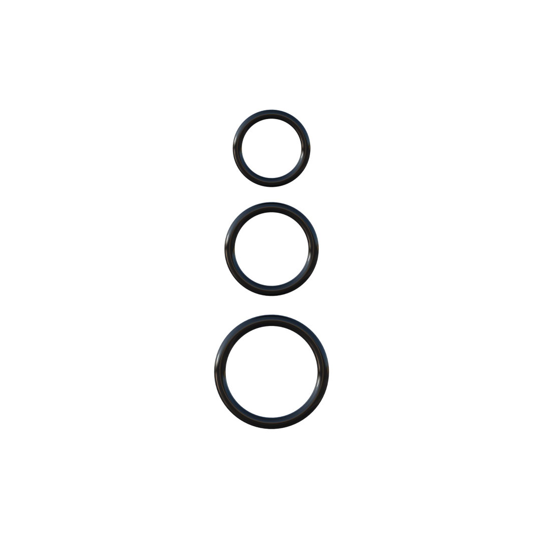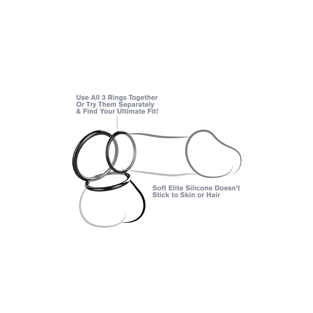 Acest set este format din trei inele de erectie super-elastice, realizate din silicon sigur pentru corp si fara ftalati. Dispozitivele au diametre diferite (3.1 cm, 4 cm, 5 cm) pentru a se potrivi perfect si a restrictiona delicat fluxul sanguin. Culoarea neagra adauga o nota de discretie si eleganta.