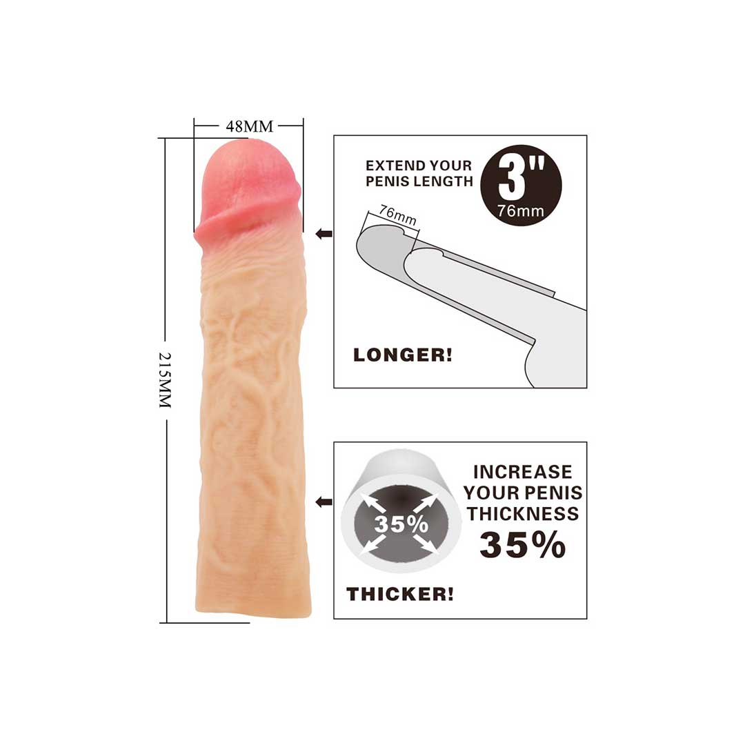 Designul impermeabil permite utilizarea fara griji in medii umede, precum dusul sau cada. Dimensiunile generoase (lungime 21,5 cm, diametru 4,8 cm) sunt potrivite pentru a amplifica senzatiile fara a sacrifica confortul. Mansonul este usor de curatat si reutilizabil, fiind o completare versatila si practica pentru viata ta intima.