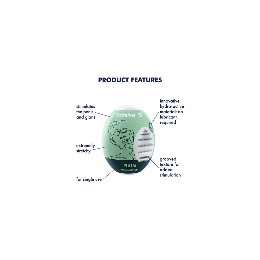 Interiorul sau este prevazut cu caneluri dense si bine definite, care maseaza intregul penis de la baza pana la varf, stimuland intens fiecare miscare. TPE-ul flexibil se adapteaza cu usurinta la dimensiunea si forma penisului, iar suprafata moale si fina imita textura pielii reale. Datorita formatului compact, oul Riffle poate fi folosit discret, fara pregatiri elaborate sau curatare ulterioara.
